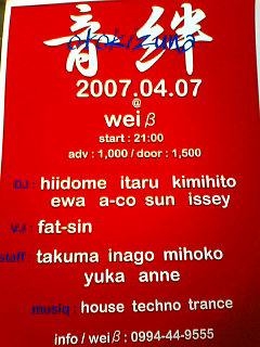 音絆 〜*〜otokizuna〜*〜 ♪おときずな♪ 2007.04.07 @ weiβ(ヴァイス)(鹿屋) ― HOUSE TECHNO TRANCE ― adv:1000/door:1500 open'21:00 DJ's*hiidome*itaru*aーco*issey*kimihito*ewa*sun* VJ's*fatーsin* STAFF's*takuma*inago*yuka*mihoko*anne* *