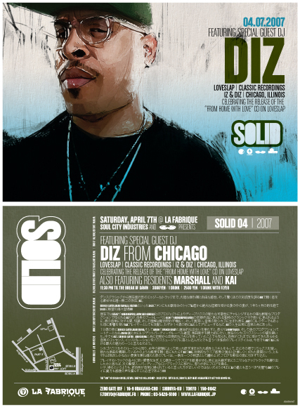 ダンスクラシックから現在進行形のエッジーなトラックまで、大胆な触れ幅と自由な感性、そして驚くほどの完成度を誇るMIXで聴く者を心酔させる唯一無二の存在 Diz が、1年5ヶ月ぶりにSOLIDに熱望の再々登場!!