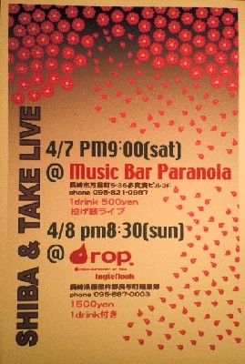 SHIBA & TAKE LIVE 2007/4/7(sat) pm9:00 @Music Bar Paranoia 1drink order 投げ銭ライブ info http://424817.jp/shiba/ http://424817.jp/take/ お店自体は普通にpm7:30から開いてます。 通常営業でLiveがある感じです。 ですので、軽い気持ちで見に来ることができます。