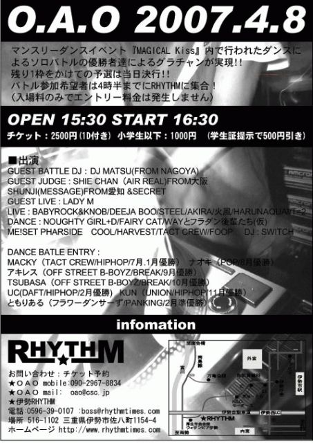 イベント告知です 4/8(SUN) 『O,A,O』@伊勢CLUB RHYTHM http://www.rhythmtimes.com/ OPEN: 15:30 START:16:30 CLOSE 21:00予定 チケット:2500円(1D付き) 小学生以下1000円 学生証提示で500円引き GUEST BATTLE DJ:DJ MATSU(FROM NAGOYA) GUEST JUDGE : SHIE CHAN(AIR REAL)FROM大阪 SHUNJI(Ryzhm Freak)FROM愛知 &SECRET GUEST LIVE : LADY M LIVE : BABYROCK &KNOB/DEEJA BOO/STEEL/AKIRA/火風/HARUKA/QUAI/T=2 DANCE : NOUGHTY GIRL+D/FAIRY CAT/WAYとフラダン後輩たち(仮)/ME!SET PHARSI