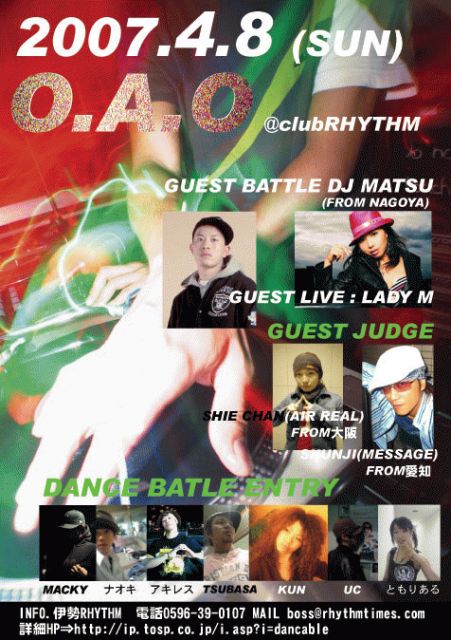 告知失礼します。不適切であればお手数ですが削除お願いします 4/8(SUN) 『O,A,O』@伊勢CLUB RHYTHM http://www.rhythmtimes.com/ OPEN: 15:30 START:16:30 CLOSE 21:00予定 チケット:2500円(1D付き) 小学生以下1000円 学生証提示で500円引き GUEST BATTLE DJ:DJ MATSU(FROM NAGOYA) GUEST JUDGE : SHIE CHAN(AIR REAL)FROM大阪 SHUNJI(Ryzhm Freak)FROM愛知 &SECRET GUEST LIVE : LADY M LIVE : BABYROCK &KNOB/DEEJA BOO/STEEL/AKIRA/火風/HARUKA/QUAI/T=2 DANCE : NOUGHTY GIRL+D/FAIRY C