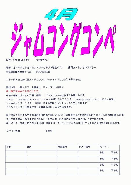 場所 ゴールデンクロスカントリークラブ(埴生CC) 乗用カート、セルフプレー 長生郡長南町市野ヶ575 0470-82-5211 プレー代¥11.000(昼食・ドリンク・パーティ・ドリンク) コンペ参加費¥4.000 景品:液晶TV、デジカメ、掃除機、などなど 競技方法 新ペリア 上限無し マイナスハンデ有りなので、だれでも優勝チャンスあり 尚、雨天の場合でも決行します。 ゴルフショップ・ジャムのインストラクター(飯岡)による無料ラウンドレッスン受け付けます ラウンドレッスンは定員になり次第締め切りとさせて頂きます。