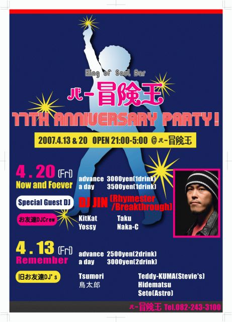 まいど〜dragonでっす。 バー冒険王17周年パーティー! 4月13日(金) Remember@バー冒険王 旧お友達DJ : Tsumori Teddy-KUMA(Stevie's) Seto(Astro) 鳥太郎 etc. 料金 : 前売り 2500円(2drink) 当日 3000円(2drink) オープン : 21:00 10年前の「冒険王黄金期」を支えたお友達DJを方々から集めた、年に一回のスペシャルナイト!! 4月20日(金) Now and Foever@バー冒険王 Special Guest DJ : DJ JIN(Rhymester/Breakthrough) お友達DJCrew : Taku Kitkat Yossy Naka-C etc. 料金 : 前売り 3000円(1d