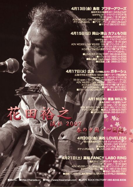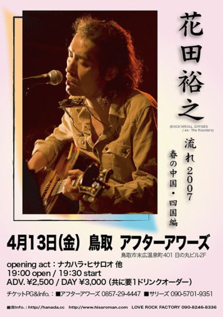 【花田裕之・流れ 2007 春の中国・四国編】 4月13日(金) 鳥取アフターアワーズ (鳥取市末広温泉町401日の丸ビル2F) 19:00 open / 19:30 start ADV ¥2,500/ DAY ¥3,000(共に 要1ドリンクオーダー) オープニングアクト:ナカハラ・ヒサロオ and more チケットPG&INFO: アフターアワーズ 0857-29-4447 サリーズ 090-5701-9351 ツアー総合INFO: http://hanada.cc http://www.hisaroman.com