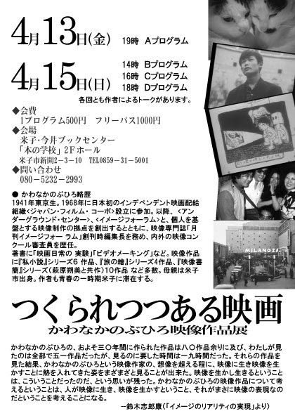 日本のアンダーグランドの重鎮で、映像作家の かわなかのぶひろ さんの映像上映会が4/13(金)と4/15(日)米子の本の学校2Fで行われます。かわなかさんは、安来に住まれてたこともあり、今回同窓会で山陰に来られるそうです。 ●イベント名:『つくられつつある映画』 ●日時:4月13日(金)Aプロ19時〜 4月15日(日)Bプロ14時〜、Cプロ16時〜、Dプロ18時〜 ●場所:米子 本の学校2F多目的ホール ●料金:1プロ500円、2プロ以上は全て1000円 ●主催:かわなかのぶひろ ●協力space-oddi