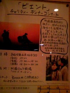 西原村のホームページより↓ -------------------------------------------------------------------------------- 西原村を拠点に、活躍中の「ビエント」のコンサートです。 収益の一部は西原村社会福祉協議会に寄付をいたします。 皆様のご購入をよろしくお願い致します。 日時 平成19年4月14日(土曜日) 17:00 受付 17:30 食事 18:50 演奏 場所 阿蘇ミルク牧場「マザーズキッチン」 チケット 3,000円(税込み) 購入希望の方は、下記までお問合せ下さ