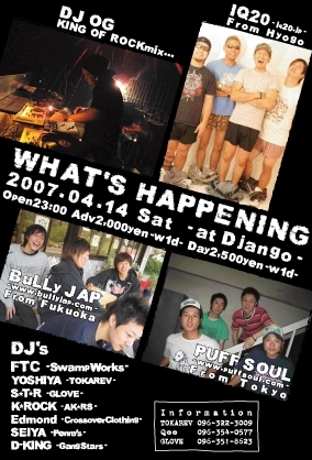☆★2007.04.14(Sat)★☆ What's Happening @Django Open&Start23:00 Adv2,000yen(w/1drink) day2,500yen(w/1drink) SpecialGuestDJ... OG (KING OF ROCKmix...) FTC feat.??? (SwampWorks) Band... IQ20 (From兵庫) http://iq20.jp/ BuLLy JAP (From福岡) http://www.bullyjap.com/ PUFF SOUL (From東京) http://www.puffsoul.com/ DJ's YOSHIYA (TOKAREV) S☆T☆R (GLOVE) K☆ROCK (AK☆RS) Edmond (CrossoverClothing) SEIYA (Penny's) D-KING (GangStars)