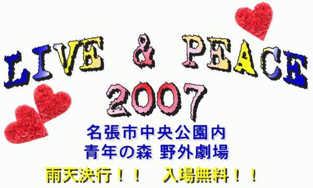 貴重なスペースお借りいたします(*- -)(*_ _) 名張の皆様こんにちは! 4月14日に夏見の公園(名張市中央公園)で 『LIVE&PEACE 2007』 と銘打った野外ライブを開催します。 ★日時★ 4月14日(土)14時頃〜 ★場所★ 三重県名張市中央公園内 青年の森 野外劇場にて ☆雨天決行!!★ ★入場無料!!☆ 津と名張と東京のバンド・ユニット6組出演します☆ 是非是非いらして下さい♪ どんどん情報が増えそうなのでまた随時書き足していきたいと思います。 名張の皆さんと一緒に楽