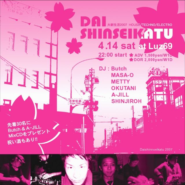 DAISHINSEIKATU 大新生活2007 [HOUSE/TECHNO/ELECTRO] ■DJ BUTCH (HOUSE/TECHNO) MASA-O(TECHNO) METTY (ROCKHOUSE) OKUTANI (DEEPHOUSE) A-JILL (TECHNO) SHINJIROH (TECHNO) ■ADV 1500yen/W1D ■DOR 2000yen/W1D ■22:00 OPEN / START ☆先着30名にBUTCH & A-JILL MixCD プレゼント!! ☆祝い酒あり 毎年春のハウス/テクノのBIG PARTY!! 新学生/社会人をガッチシ盛り上げます!!