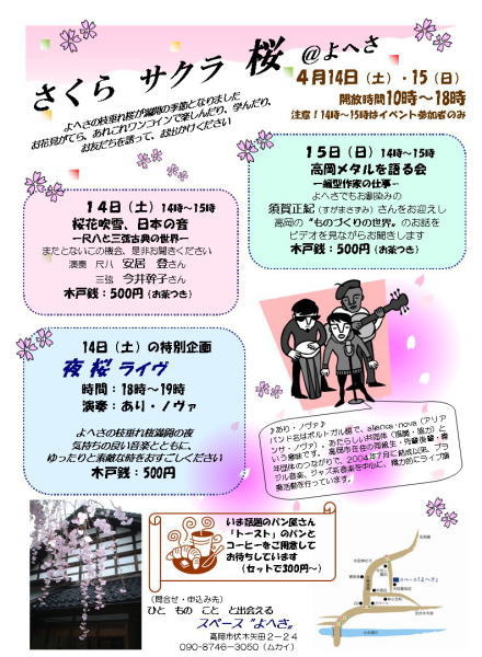 よへさの枝垂れ桜が満開の季節となりました。 お花見がてら、あれこれワンコインで楽しんだり、 学んだり、お友達を誘って、お出かけください。 2007年4月14日(土)・15日(日) 開放時間:10時〜18時 場所:高岡市伏木矢田2-24 スペース"よへさ" イベント 14日(土)14時〜15時 桜吹雪、日本の音―尺八と三弦古典の世界― 演奏 尺八:安井登さん 三弦:今井幹子さん 木戸銭:500円(お茶つき) 14日(土)18時〜19時 夜桜ライヴ 演奏:あり・ノヴァさん 木戸銭:500円(お茶つき) 15日(日)14時〜15時 高岡メタルを語る