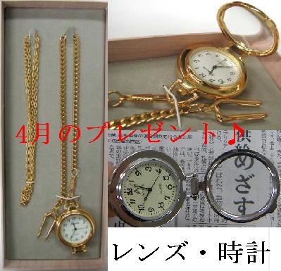 今回のプレゼントは、最近仕入れた商品で結構人気の懐中時計です。 デザインもなかなかいいのですが、凸レンズが付いてて、文字盤を大きく見やすくしているのもそうなのですが、そのレンズ部分が自由に動かせますので、色んな物を拡大させて見る事が出来ますので、虫眼鏡としても使える優れものなのですよ♪ また、付属のチェーンが2種類ありますので、用途に合わせてペンダント状になったり、ベルトに吊ったり自由なかたちで携帯できますヽ(^o^)丿 老若男女、様々な方にお使い頂けますが、箱付ですのでプレゼントとしてもいいのではないでしょうか