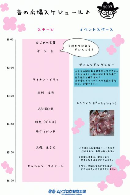 【動物王国音楽祭】 共演:ムツゴロウさん/大塚まさじ(ex.ザ・ディラン)/石川浩司(ex.たま)/ライオンメリィ/他 11:00〜16:00 ASTRO-Bの出演予定時間は13:00過ぎ イベントスケジュール http://www.tokyo-mutsugoro-oukoku.co.jp/images/musicsche.jpg 場所:ムツゴロウ動物王国「青の広場」 ※芝生の上に座ることになります。敷物が必要な方はご用意下さい。 入場料:大人\1700 小学生まで\700 犬\1000(おみやげ付) ※犬連れの入国には書類が必要です。犬連れルールをご覧下さい。↓ http://www.tokyo-mutsugoro-oukoku.co.jp/musicdogru