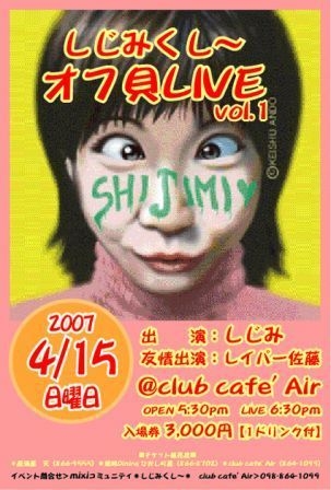 しじみ沖縄移住への道企画・第一弾!! スペシャルゲストに真面目な下ネタ芸人、レイパー佐藤を迎え、 しじみとレイパー佐藤のモノマネショーをオフ貝ライブと称して開催します♪ 普通のライブではなく、親睦を深める為のオフ貝ライブにしたいと思っております。 出会いや交流の場として、是非ご参加ください。 ショー終了後は出来るだけ多くの皆さんと、 一緒に呑んで話して廻りたいと思います♪ サプライズゲストも有るかも! mixiやってる人も、やってない人も参加OK〜! うちな〜んちゅの皆さん、 お