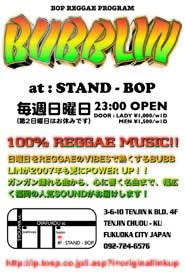 さて今週の日曜日はREGGAE TOWNのレギュラーコーナー にも載っているBUBBLINです。毎週日曜日(第2以外) 福岡の天神、親富孝通りのSTAND-BOPのREGGAE PROGRUM です。週末遊べない人も遊び足りなかった人も毎日REGGAEを 聞きたい人も肩の力を抜いて遊べる空間です。
