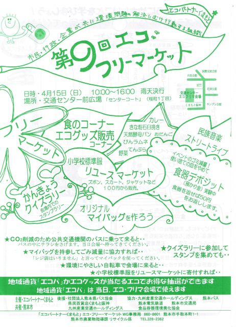 今年も交通センター前広場「センターコート」でエコ・フリー・マーケットを開催します。 日時 :平成19年4月15日(日) 10:00〜16:00 場所 :交通センター前広場センターコート 主催 :エコパートナーくまもと フリーマーケットもありますが、エコフリマの本来の目的は、来場者も参加する楽しい体験型環境イベントです。ですから、食器のデポジット実験など色々な試みも会場でやっています。是非経験してみてください。 また、マイバッグ持参の方、バスできた方、標準服を寄付する方など、来場者が環境に優しいことをすれば、