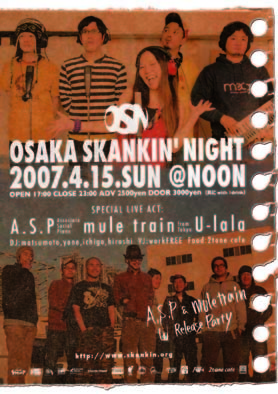 OSAKA SKANKIN' NIGHT ♪A.S.P&mule trainダブルレコ発パーティー♪ 4/15(SUN)@CLUB NOON OPEN 17:00 CLOSE 23:00 adv 2500yen door 3000yen(共にwith 1drink) Pコード 253-582 【SPECIAL LIVE ACT】 A.S.P(Associate Social Piano) mule train(from Tokyo) U-lala 【DJ】 Matsumoto,Yone,Ichigo,Hiroshi 【VJ】 workFREE 【FOOD】 2tone cafe スカンキンナイト4月号は大阪発お洒落系サウンドを自由自在に奏でるA.S.Pと東京発 オールラウンドSKAバンドmule trainのダブルレコ発パーティーをドドーンとやっちゃいまっ