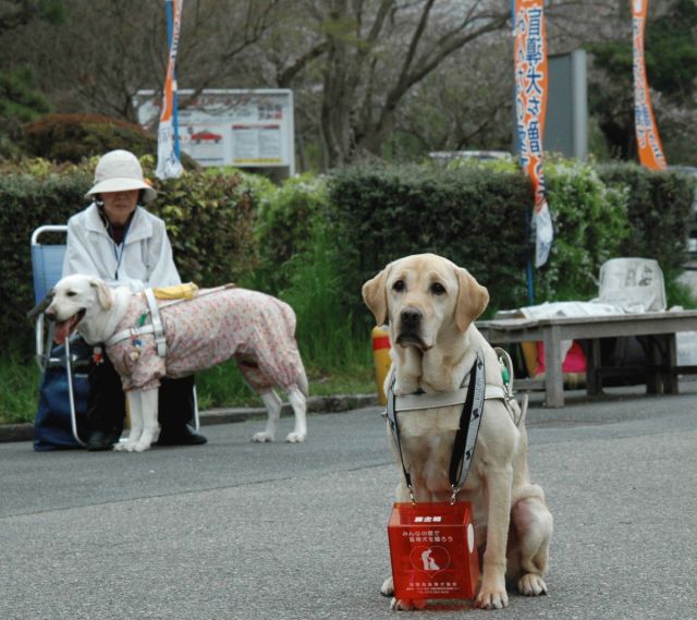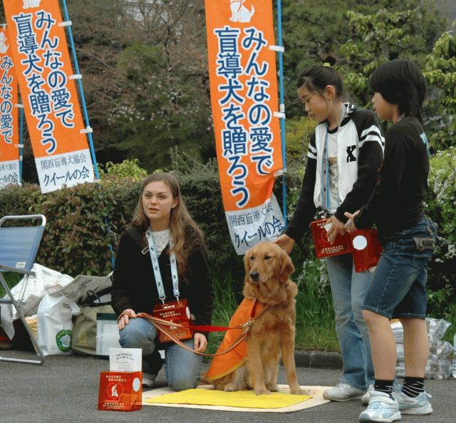 関西盲導犬協会ボランティアグループ「クイールの会」による街頭募金です。 現役盲導犬、引退盲導犬、繁殖犬なども参加します。 募金は盲導犬育成と引退盲導犬の医療費に使用します。 お近くの方は是非ご協力をお願い致します。 写真1 PR犬のラフィ(映画のクィール役) 写真2 子供たちも留学生もボランティア参加(繁殖犬ボニー)