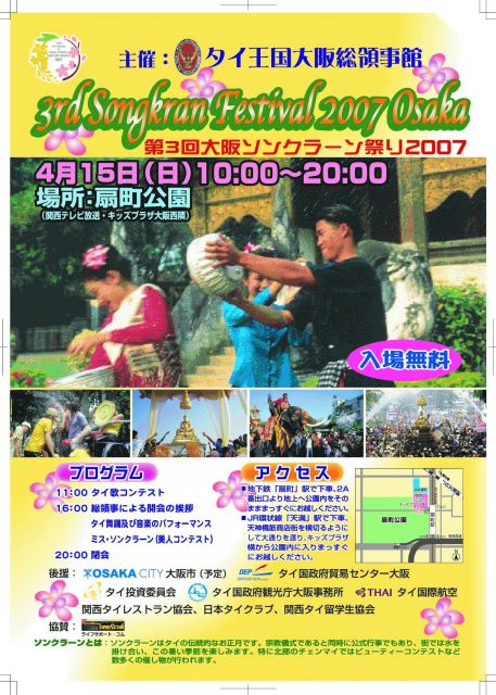 今年の大阪ソンクラーンは、ローイクラトンでお馴染みの扇町公園に場所を変えて行われます。 <プログラム> 10.00 プログラムの紹介 タワッチャイ・プラサートサング氏によるタイの歌 10.30 タイの歌のコンテスト、予選 11.30 タイレストラン協会の音楽演奏 12.00 大阪外国語大学学生によるタイ舞踊 13.00 タワッチャイ・プラサートサング氏によるタイの歌 13.30 ナータリラータイカルチャーセンターによる舞踊 14.00 タイの歌のコンテスト、決勝 15.00 ナータリラータイカルチャーセンターによる舞踊 タイの歌の