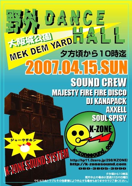 MEK DEM YARD 4月15日(日) 大阪城野外 夕方〜夜10時まで 出演 DJ KANAPACK MAJESTY FIRE FIRE DISCO SCORPION AXXELL SOUL SPICY 詳細 http://k-zonesound.com/ ジャーク チキンあり!