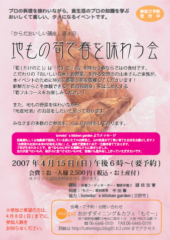 みなさまこんばんは、管理人まめってぃです。 ちょっとしたイベントの告知をさせて頂きます。 第4回からだにおいしい講座「地もの筍で春を味わう会」 2007年4月15日(日) 午後6時〜(要予約) ------------------------------------------------ 申込先:おかずダイニング&カフェ もぐー TEL 06-6446-0101 FAX 06-6445-0779 E-mail: info@cafemogu.com ・必ず事前のご予約・お申し込みをお願い致します。 ・参加ご希望の方は、4月8日(日)までにお申込くださいませ。 ・メールでお申し込みいただいた場合は、 mogu;より「受
