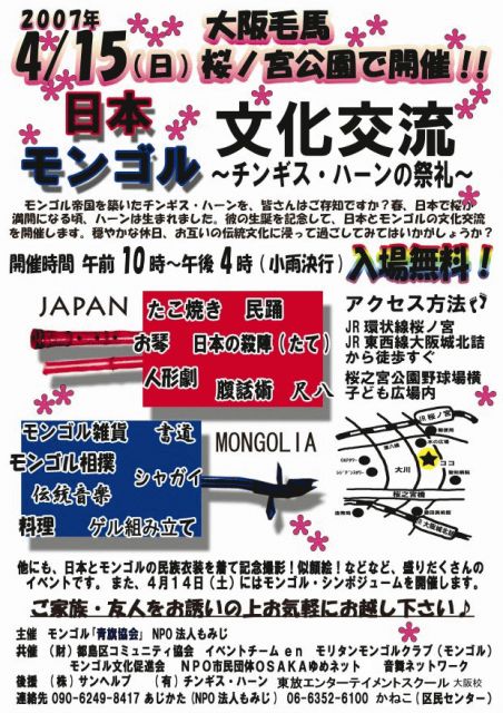 入場無料!! ゲルあります!馬頭琴もあります!(たぶん) ホーショールやボーズなどのモンゴル料理も♪ お近くの方、お誘いあわせのうえ ぜひお越しくださーい!! -------------------------------------------------- 主催:モンゴル「青旗協会」 NPO法人もみじ 共済:(財)都島区コミュニティ協会 en モリタンモンゴルクラブ モンゴル文化促進会 NPO市民団体OSAKAゆめネット 音舞ネットワーク 後援:(株)サンヘルプ (有)チンギス・ハーン 東放エンターチメントスクール大阪校 ●問合せ● 090-6249-8417 あじかた(NPO法人もみじ)