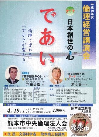 年に一度の熊本市中央倫理法人会の「倫理経営講演会」の開催が決定しました。 テーマ「であい」 ●講師(社)倫理研究所 法人局 法人スーパーバイザー 戸田栄造 氏 「演題」 「日本創世の心」であい ●事業体験報告者 テーマー出会い ?スリースリー・カーセンター 代表取締役 石丸貴一氏 ●開催日時:2007年4月29日(木) 17:30受付 18:30開演〜20:30 ●講演会費:2.000円(前売チケット販売中) ●場所:熊本県立劇場 大会議室 ●後援:文部科学省 熊本商工会議所 ●お問い合わせ先:熊本市中央倫