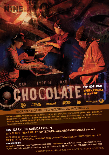 関内に新しくオープンしたクラブ「The NINE」で、毎週金曜日「chocolate」と題してhiphopを中心にがっちり踊らせます。EAST、WEST、SOUTH関係なく幅の広い選曲で、DJ達が金曜の夜を演出します。