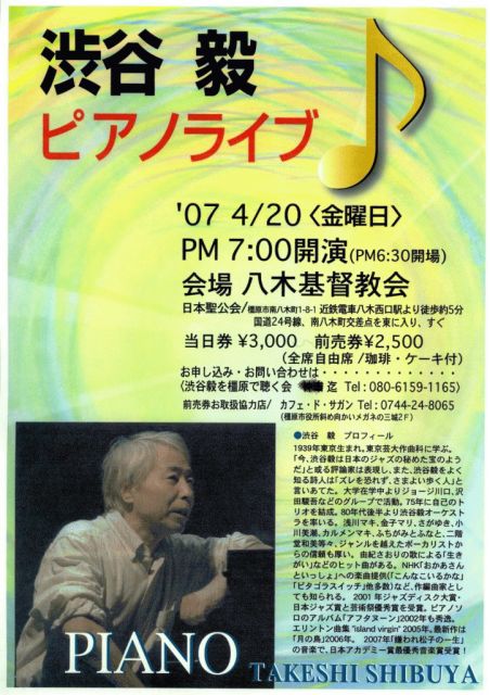 日時:4月20日(金) 午後7時開演 場所:八木基督教会 料金:当日3千円 前売2千5百円 経路:近鉄 八木西口駅 下車 徒歩3分 JR 畝傍駅 下車 徒歩3分 駐車場:なし