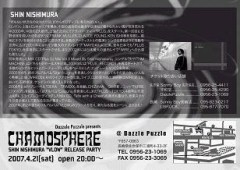 管理人様、 告知失礼致します。 CHAMOSPHEREとは…。 佐世保の音楽シーンにDJ/クリエイターを絡めて新しい形のPARTYを提案するプロジェクト。 CHAMOSPHEREはクリックハウス、ディープミニマルを軸にオーディエンスを本能のままに踊らせます。 非日常的な空間で深いとこまで音に浸ってみませんか?? 第一回目のCHAMOSPHEREはGUEST DJとして、アルバムVLOWをリリースしたばかりのSHIN NISHIMURA氏を迎えます。 アルバムVLOWの世界観を今のリアルなSHIN NISHIMURA氏のDJで体感して下さい!! 『Dazzle Puzzle presents SH