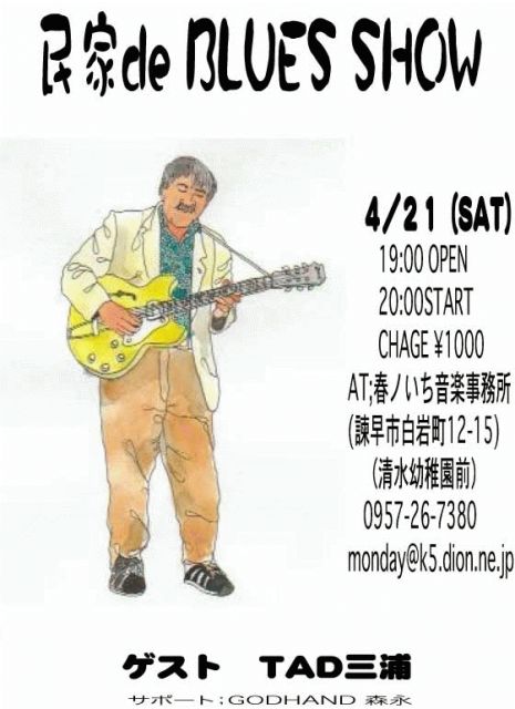 TAD三浦ブルースショー http://mixi.jp/show_friend.pl?id=635095 場所;春ノいち音楽事務所(場所はリンク先で確認ください) http://www.h7.dion.ne.jp/%7Emonday/ ミュージックチャージ¥1000 サポート;GOD HAND 森永(諫早ロバートジョンソン) *民家で開催のため25人限定(予約はメールで) monday@k5.dion.ne.jp