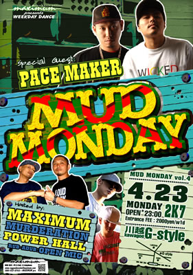 うっつん!!久々です!! こんなところから失礼します!! "MUD MONDAY Vol.4"は 東京から毎月第3土曜の渋谷をROCKし続ける "MASTER BLASTER"のHOST SOUND "PACE MAKER"が 2007.3.7に発売されたMIX CD "MASTER BLASTER 2007" を引っさげ埼玉・川越に-RIDDIM DRIVIN'-しに来まっせ!! もちろんHOST SOUNDはMAXIMUM, POWER HALL, MURDERATIONが向かえます!! それと、埼玉近郊のDJ, Singer, etc...の方々!! 毎月、埼玉のラバダ部の RIN, JELLY THE KID, たかだじゅんじ, MASSASSINが 毎