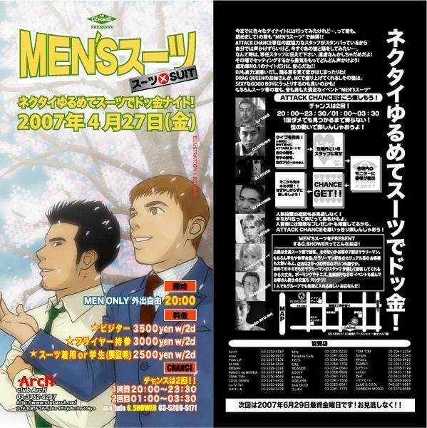 『ボーズdeスーツ』コミュ会員の皆様、こんにちは! 今週末、4月27日(金)は『Men'sスーツ☆』開催です。 今回の『Men'sスーツ☆』は新たにGOGOの登場で、 パワーアップ!!! GW前の盛り上がり気分で、 飲んで、踊って、ついでにオトコも 見つけよう! 新入社員も恥ずかしがらずにどんどん参加だね?! きっとイイこと起こるハズ! ◇◇◇◇◇◇◇◇◇◇◇◇◇◇◇◇◇◇◇◇◇◇◇ スケジュール: 4月27日(金)20:00〜 外出自由 場所: 新宿Club ArcH DJ: ATSUSHI/TAKE