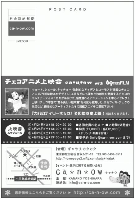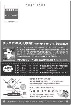 ca*n*ow Handmade Shop 『チェコとヨゼフ・パレチェク』 4月24日(火)〜4月29日(日) 24日は21時迄、28日は20時迄、最終29日は 17時迄OPENとなっております。 ギャラリ・カタカタ Galeri katak-katak 東京都世田谷区宮坂3-21-13 TEL 03-3439-5511 8名のhandmade作品に加え、それぞれが、『チェコと絵本作家ヨゼフ・パレチェクの作品』を テーマにアクセサリーや人形、雑貨を作って展示販売します。 また、九州の69'nersFILM さんに協力頂いて、チェコアニメの上映を行います。