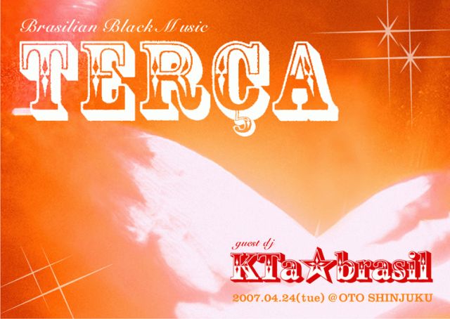 春ですね! 新しい季節のお祝いを是非テルサでいたしましょう! --------------------------------------------- <TERCA> 4月24日(火)※毎月第4火曜日 22:00~ 2000 yen(with 1drink) ※フライヤー持参の方はディスカウント500円引き!! @OTO:新宿区歌舞伎町1-17-5-2F / TEL:03-5273-8264(22:00~) DJ: 堀内隆志(cafe vivement dimanche) 大島忠智(balanca nova discos) 伏黒新二(Musica LocoMundo) 中村智昭(MUSICA NOSSA/Cafe Apres-midi) 高橋稔 GUEST DJ:KTa☆brasil http://blog.excite.co.jp/ktabr