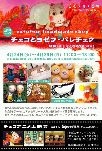 ca*n*ow Handmade Shop 4月のテーマ:『チェコとヨゼフ・パレチェク』 8名のhandmade作品に加え、それぞれが、 『チェコと絵本作家ヨゼフ・パレチェクの作品』をテーマに アクセサリーや人形、雑貨を作って展示販売します。 また、九州の69'nersFILM さんに協力頂いて、 チェコアニメの上映を行います。 ■開催期間■ 4月24日(火)〜4月29日(日) ■開催場所■ 経堂 ギャラリ・カタカタ Galeri katak-katak (http://homepage2.nifty.com/katak-katak/) ☆OPEN☆ 11:00〜18:00 *上映と搬
