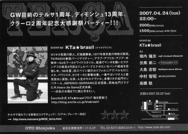 KTa☆brasilさん出演イベントのお知らせです!! SAMBA NOVAファンの方、KTa☆さんファンの方!! テルサも楽しいですよ〜♪ --------------------------------------------- <TERCA> 4月24日(火)※毎月第4火曜日 22:00~ 2000 yen(with 1drink) ※フライヤー持参の方はディスカウント500円引き!! @OTO:新宿区歌舞伎町1-17-5-2F / TEL:03-5273-8264(22:00~) DJ: 堀内隆志(cafe vivement dimanche) 大島忠智(balanca nova discos) 伏黒新二(Musica LocoMundo) 中村智昭(MUSICA NOSSA/Cafe Apres-mi