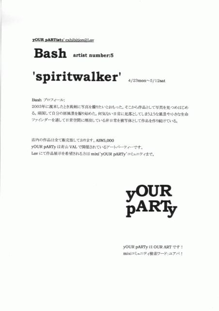 Bash写真展@Lav 『spiritwalker』 Bash プロフィール: 2003年に渡米したとき真剣に写真を撮りたいとおもった。そこから作品として写真を見つめはじめる。帰国して自分の原風景を撮り始めた。何気ない日常に見落としてしまうような風景や小さな生命 ファインダーを通して日常空間に埋没している非日常を被写体として作品を作り続けている。 毎度おなじみ(!?)Bashさんhttp://mixi.jp/show_friend.pl?id=445802の写真展ですm(__)m ユアパの最初の頃からユアパ当日撮影を自ら引き受けてくださるなど、多大な貢献をしてくださったBashさ