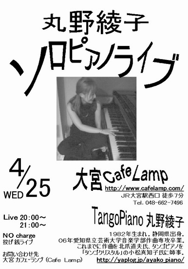4月25日(水)に大宮カフェランプにて http://www.cafelamp.com/(JR大宮駅西口より徒歩7分) タンゴピアニスト丸野綾子の、 ソロピアノライブがあります。 ライブは20時〜と21時〜で、 チャージ無しの、投げ銭ライブです。 丸野綾子ワールドを堪能できること間違いなしです^^ ご期待下さい! 丸野綾子ブログ http://yaplog.jp/ayako_piano/ 丸野綾子コミュニティ http://mixi.jp/view_community.pl?id=1799291