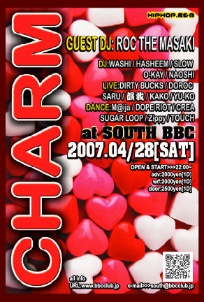 [CHARM] 2K7.04.28[SAT] @SOUTH BBC 22:00 OPEN!!! HIPHOP,R&B =GUEST DJ= ROC THE MASAKI =DJ= WASHI / HASHEEM SLOW / O-KAY NAOSHI =LIVE= DIRTY BUCKS DOROC SARU / 韻我 KAKO / YU-KO =DANCE= DOPE RIOT / CREA SUGAR LOOP Zippy / TOUCH adv:2000yen[1d] ハw/f:2000yen[1d] day:2500yen[1d] *先着15名様にSOUTH BBC灰皿をプレゼント!!! SOUTH BBCにてまた新しいEVENTが始まります。 その名も[CHARM]!!!間違いない出演者で朝までお届け!!! もちろん振る舞い酒あり!!! 週末は家にいないで 音と酒に酔いしれましょう!