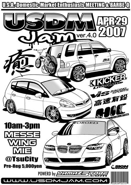 イベント告知を忘れてました。 エントリー1台 5000円(Tシャツ等お土産つき) エントリーはこちらです http://www.usdmjam.com/ http://www.geocities.jp/usdmjam/reg004.html スポンサー様のお店からもエントリー出来ます KICKER JAPAN 045-858-6325 (神奈川 横浜) impex (VIS JAPAN) 059-655-5156(三重 松阪) BERNESE (三重 鈴鹿 津) AUTO TECHNIK 06-6568-7950(大阪 浪速) CLAP a.k.a HIS 06-6701-4472(大阪 東住吉) サウンドコネクション046-263-5945(神奈川 大和) 8ボールオートワークス 0598-51-9444(
