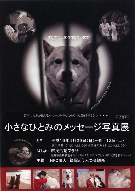 人間に捨てられ、動物収容施設で殺処分の時 を待つどうぶつたちの最期の肖像を写した写真展です。 どうぶつを飼っている方も飼っていない方も是非ご覧になってください。 どうぶつ会議所 http://www.animal-fukuoka.org/ 場所 http://www.isquaresaga.jp/ ご不明な点があればメッセお願いします。