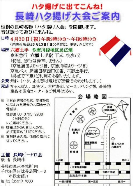 関東圏にお住まいの方へお知らせです。 好例のハタ揚げ大会が今年も催されます。 場所は、京浜急行六郷土手駅近くの多摩川! 長崎ビードロ会主催ですので、北高以外にも市内の高校関係者等も参加します。 懐かしい顔があるかも・・・。 当日は、六郷土手駅から案内が出ています。 会場では北高のノボリを目印にどうぞ。 気軽な服装で、お越し下さい。 詳細は、添付の画像をご覧下さい。 ゴールデンウィーク、ご家族で、友人と、一人でもオッケー! カモン、北高同窓生!! 青空の下、ちゃんぽん・皿うどん・焼きあご・かんぼこをつ