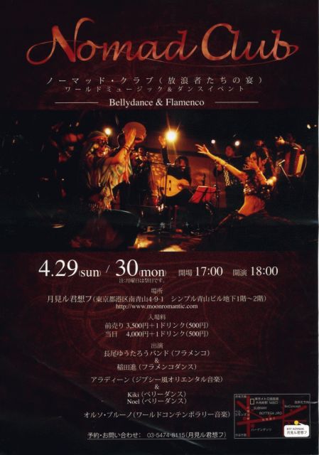 管理人様、告知失礼します。 昨今ブームを巻き起こしつつある ベリーダンスとフラメンコ 各界を担う若手アーティスト達による「歌」と「踊り」と「夢」の供宴! スペインのグラナダを中心に、 ヨーロッパ、中南米で活躍していた フラメンコ・ギタリスト 「長尾ゆうたろう」プロデュースの ワールド・ミュージック・フェスティバルの第2弾! 「旅の子供たちが集う。 ポスト・クラブ世代のミーティングに参加せよ! そして、新しい神話の時代が始まる音を聴け!!」 --- by 久保田麻琴 --- 音の錬金術師「久保田麻