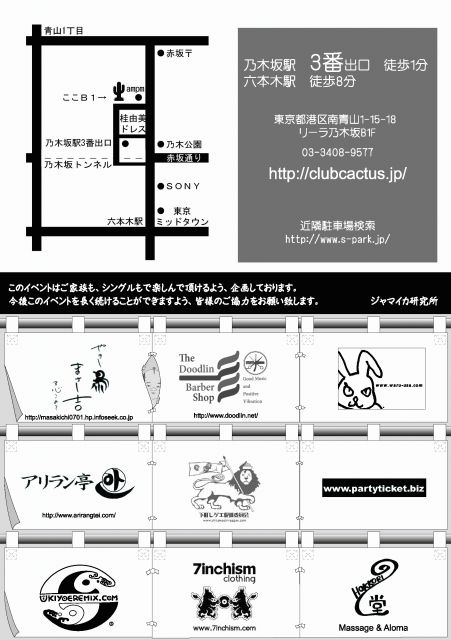 こんにちは。ジャマ研というコミュをやってるナカジ♀です。 是非遊びに来てもらいたいイベントがあるので、告知させてください。 4月30日(祝日:月曜日) 15時から20時まで♪ 2000円1ドリンク レゲエのクラブで知る人ぞ知るclub cactusで、 http://clubcactus.jp/index.html お子様連れウェルカムなイベントやることになりました。 当日は >キッズコーナーあり >VIPルームは授乳室に >オムツが替えられるスペースも用意 家族もシングルも楽しめる、楽しいイベントにしたいと思っています。是非遊びに来て下さい。 ジ