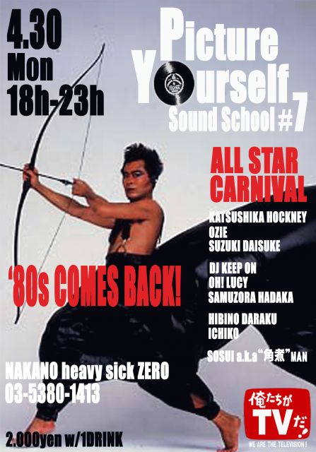 情報は随時更新。通常スタイルに戻ります。 クラブイヴェントだしいつ来てもらっても結構。 これからは中野heavy sick ZERO。 お好きに飲んだり食ったり、まったりしてくださいな。 ■Picture Yourself Sound School #7 ■日時 2007.4.30.MON 18h-23h (予定) ■場所 中野 heavy sick ZERO http://www.heavysick.co.jp/zero/ (公式サイト) http://tinyurl.com/ya3suc (powered by ヤフー!地図) ■料金 2,000円 (with 1 DRINK) ■出演 (予定, *は確定) DJ 亜湖派とかほり派* 「スネークマンショーとその時代」 遅塚勝一 (CMデ