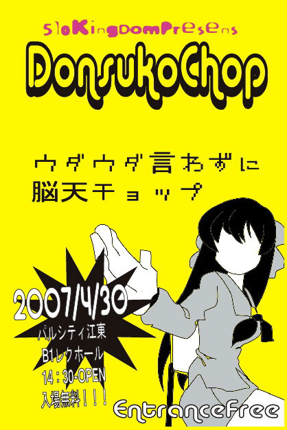 ドンスコキックを昼に見たい! そんな要望もいくつか頂きやっちゃいます ちなみに会場の地図の詳細はここね http://mixi.jp/view_album.pl?id=1385621 昼版のタイトルとしてドンスコチョップと題して やっちゃいます 映像コンテンツ、参加型うろ覚えコンテスト、PJ 今回は後藤の炊き出しを先着順で振舞います 何を出すかはお楽しみに ※只今、DSお料理ナビで修行中です それと今回入場無料です 所謂タダなんですが、皆さん電車賃もかかるので コンテンツに抜かりないようにがんばります 皆でコスしたり仮装したり駄目