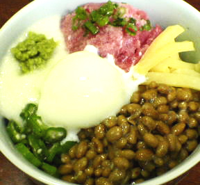 お待たせ(?)しました! 第1回「ねばパーティ」(略して、ねばパー)開催決定。 記念すべき初回を飾る開催地は・・・。 EJMさん邸です! 当日は、管理人が栃木より地物の烏骨鶏卵、山芋(できたら自然薯)等を収穫(購入)予定! 皆さん、「これは!」というネバアイテムを持ち寄り、ネバネバしましょう。 小粒〜大粒のあらゆるメーカー、種類の納豆品評会をはじめ、 トッピング食べ比べなども企画中です。