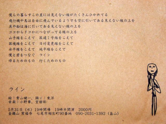 イベントの告知です。 今回は、渋さ知らズや大豆鼓ファームで活動しているアーティストたち4人が登場です。 ライブペインティングに舞踏。能登ではなかなか見れないパフォーマンスをこの機会に!!! 「ライン」 5月31日(水)19時開場 19時半開演 2000円 会場:金鶏山常福寺(七尾市相生町90) 地図:http://map.yahoo.co.jp/pl?nl=37.2.27.523&el=136.58.10.057&la=1&sc=2&skey=%BC%B7%C8%F8%BB%D4%C1%EA%C0%B8%C4%AE&CE.x=230&CE.y=245 絵:青山健一 http://aoken.aoken.info/ 踊り:松原東洋 音楽: