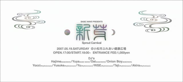告知失礼します −BASICWAVE Presents− SPROUT CARNIVAL 5/19(SAT) @小松市ふれあい健康広場 OPEN17:00/START18:00〜 ENTRANCE FEE 1,000円 <DJ'S> HAJIME DAI YUYA ONION BOY RISE AKIRA TAJI YOCCI YU YUSUKE おいし〜いビールに、おいし〜いサンドウィッチ、そして何といってもおいし〜い音を楽しんで下さい♪ パーティは朝までやっているので、いつでもお祭り気分で遊びに来て下さい!