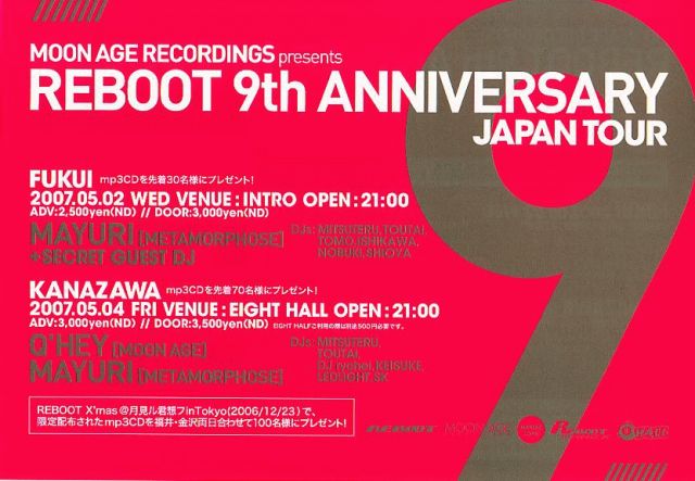 REBOOT 9th ANNIVERSARY JAPAN TOUR 2007.05.04(FRI) @ EIGHT HALL(金沢) http://www.eighthall.com OPEN : 21:00 ENTRANCE FEE ADV : 3,000yen(no drink) door : 3,500yen(no drink) ※EIGHT HALF(ラウンジ)をご利用の際は別途500円必要です。 先着70名様にREBOOT X'mas@月見ル君想フinTokyo(06/12/23)で限定配布されたmp3CDをプレゼント!! GUEST DJ Q'HEY(MOON AGE) MAYURI(METAMORPHOSE) DJ's MITSUTERU / TOUTAI / DJ ryohei / KEISUKE / LEDlight / SK Q'H